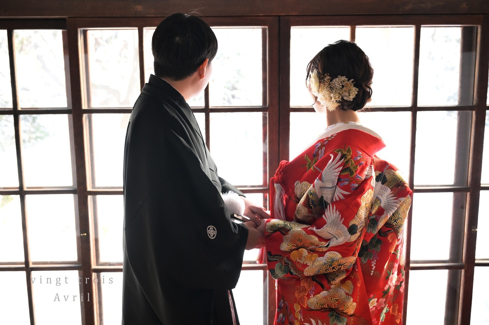 雪の光が差し込む畳部屋で、色打掛が幻想的に映える。紋付袴の新郎と並ぶ姿は、前撮りやフォトウェディングにぴったりな、冬の和装婚礼の一枚です